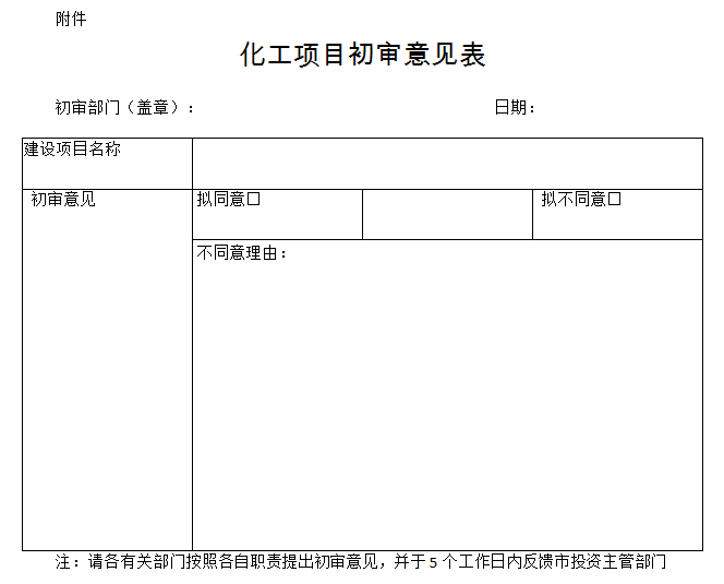 对各地上报的化工项目,由市投资主管部门牵头,会同市环保、维稳、安监、规划、国土等部门对项目进行联合会审。严格审查后,按照化工项目备案程序办理相关手续,各部门初审时间不超过5个工作日。备案需提供的资料包括:项目申请报告(有资质单位编制);市安监局、市环保局、市维稳办、市规划局分别出具的化工项目初审意见表(见附件)。