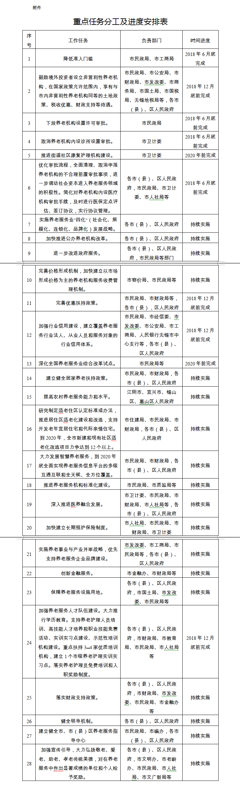 为认真贯彻落实党的十九大精神,坚持以习近平新时代中国特色社会主义思想为指导,全面推进养老服务业新发展,更好地满足我市广大老年人日益增长的美好晚年生活需要,根据《国务院办公厅关于全面放开养老服务市场提升养老服务质量的若干意见》(国办发〔2016〕91号)、《省政府关于全面放开养老服务市场提升养老服务质量的实施意见》(苏政发〔2017〕121号)、《省政府办公厅关于制定和实施老年人照顾服务项目的实施意见》 (苏政办发〔2018〕1号)的总体部署,现就全面放开我市养老服务市场,提升养老服务质量提出如下实施意见。