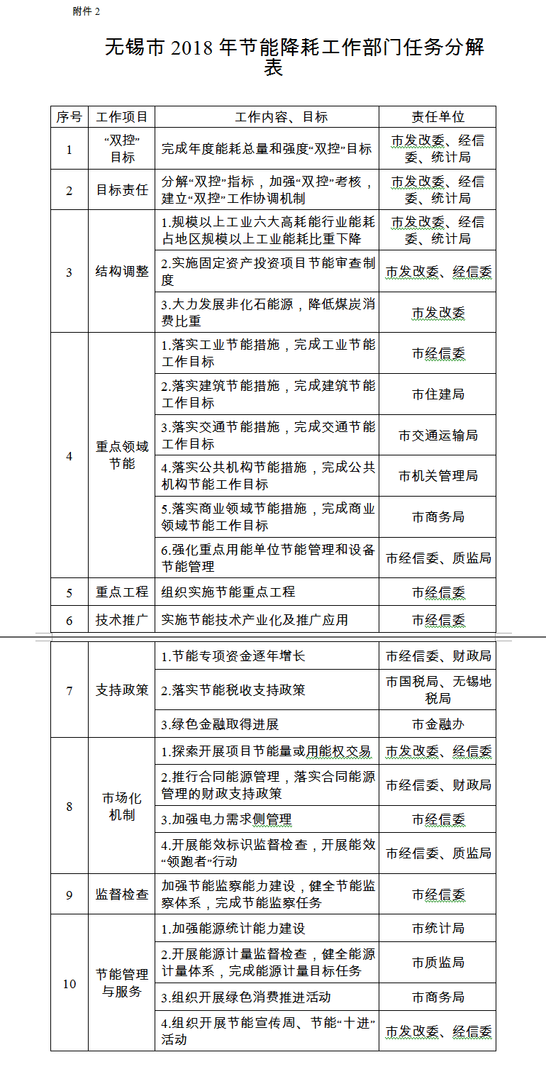 1.实施重点用能单位“百千万”行动。组织149家2015年度能耗万吨标准煤以上的单位加入重点用能单位“百千万”行动。按照《中华人民共和国节约能源法》《重点用能单位节能管理办法》等有关法律法规要求,加强节能管理,落实各项节能措施。主要包括强化节能目标责任,建立健全能源管理制度,严格执行能源利用状况报告、能源管理岗位和能源管理负责人等制度,建立健全能源管理体系,加强能源计量统计,开展能源审计,开展能效达标对标活动,推动能耗在线监测,实施节能技术改造等。根据省分解下达的能耗总量和强度“双控”目标,结合无锡重点用能单位实际情况,合理分解本地区“百家”“千家”“万家”企业“十三五”及年度能耗总量控制和节能目标(简称“双控”目标),并进行“双控”目标责任评价考核,评价考核结果纳入社会信用记录系统,对未完成“双控”目标任务的重点用能单位暂停审批或核准新建扩建高耗能项目。