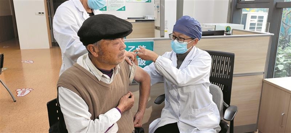 在接种室,医生给华老伯测量了血压,确认没问题后,当面与华老伯核对了疫苗名称和批号,随后给他注射了疫苗,并告知接种后的注意事项。“这里的医生态度很好,服务也很周到。”华老伯满意地说。