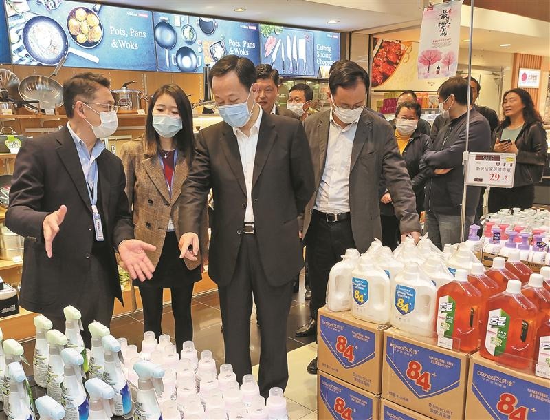 助力企业复工复产。图为市政协调研商贸流通企业复市营业情况。