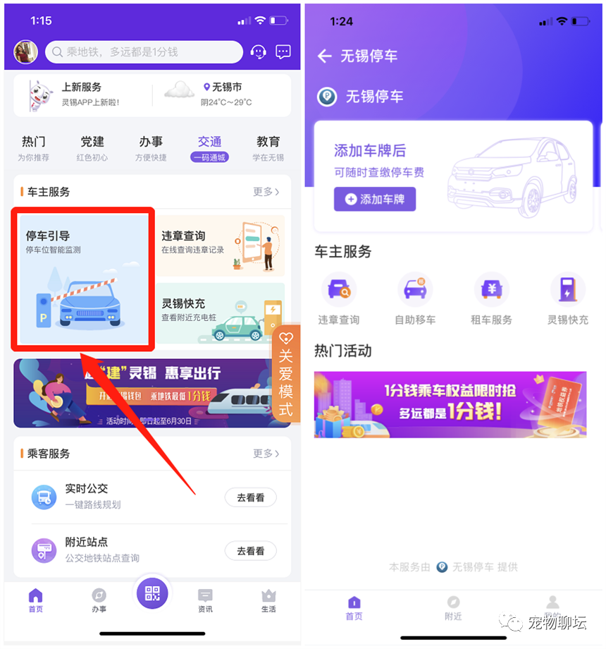 第一步,点击进入“灵锡”APP首页—【交通】版块—【停车引导】功能;
