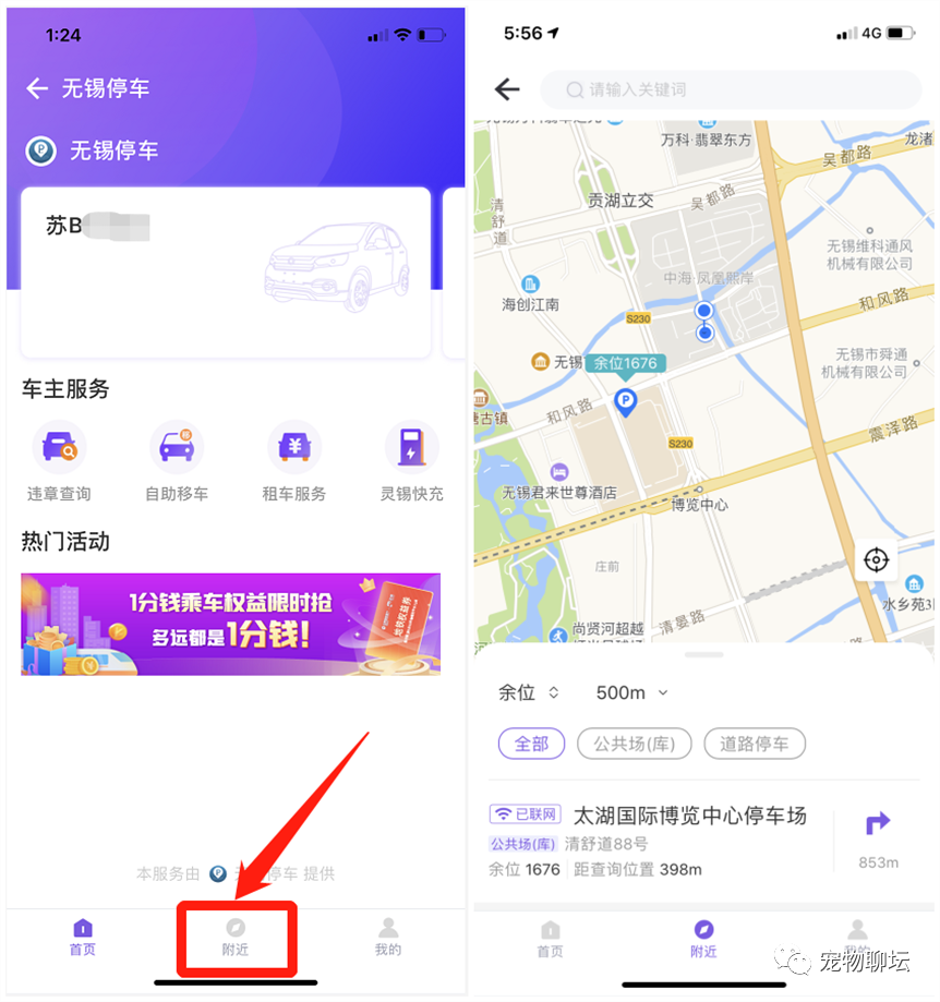第三步:点击【附近】可查看距您最近的停车场,300米、500米、1000米范围内的车位数量一目了然,或者您可选择在【搜素栏】直接输入目的地关键词,查找目的地附近的停车场。
