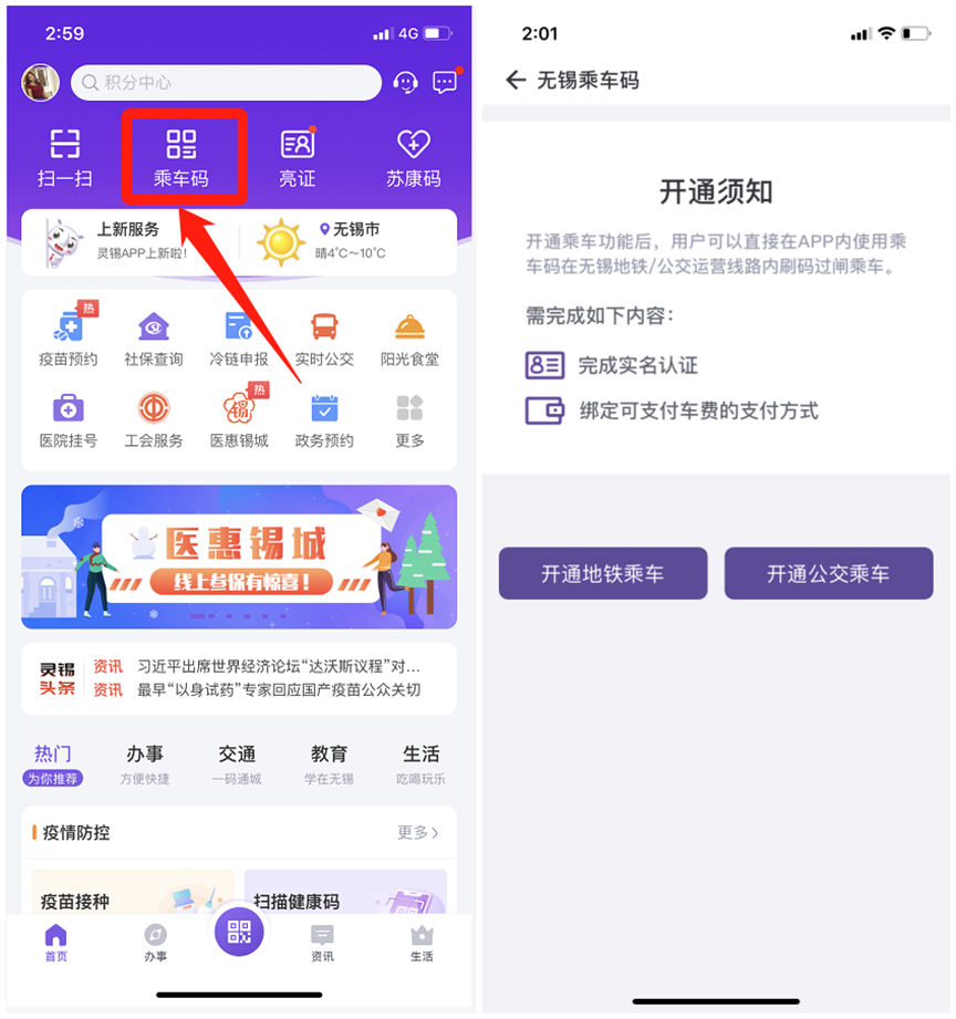 进入“灵锡”APP乘车码开通页面