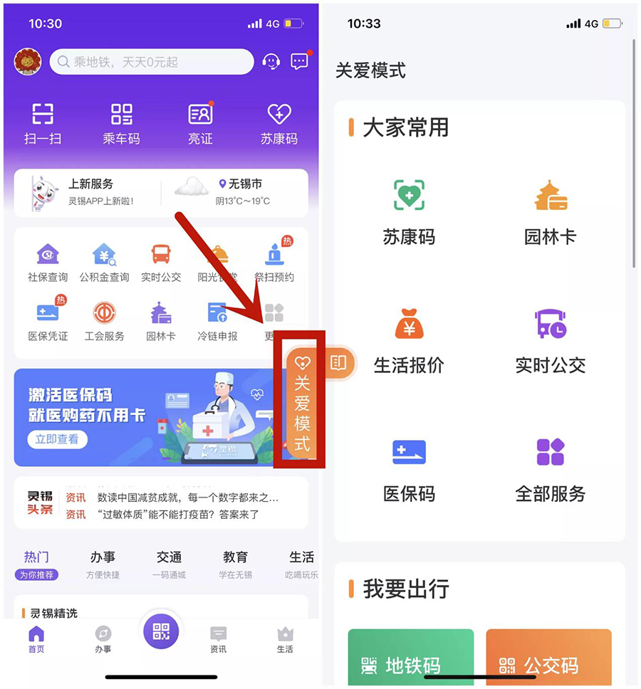 打开灵锡APP首页,点击页面右侧“关爱模式”按钮,便可切换至“长者关爱模式”。在此模式下,APP页面交互设计更简约明了,放大字体、调亮色调、按钮入口醒目显眼,让视力下降的老年人也能看清屏幕。对于老年人来说,“少即是多”。关爱模式进行了业务、服务简化,围绕老年人日常生活中的高频事项及服务场景,设置“大家常用”、“我要出行”、“医疗健康”、“爱生活”四大板块,精简实用、一目了然,大大降低上手使用难度。