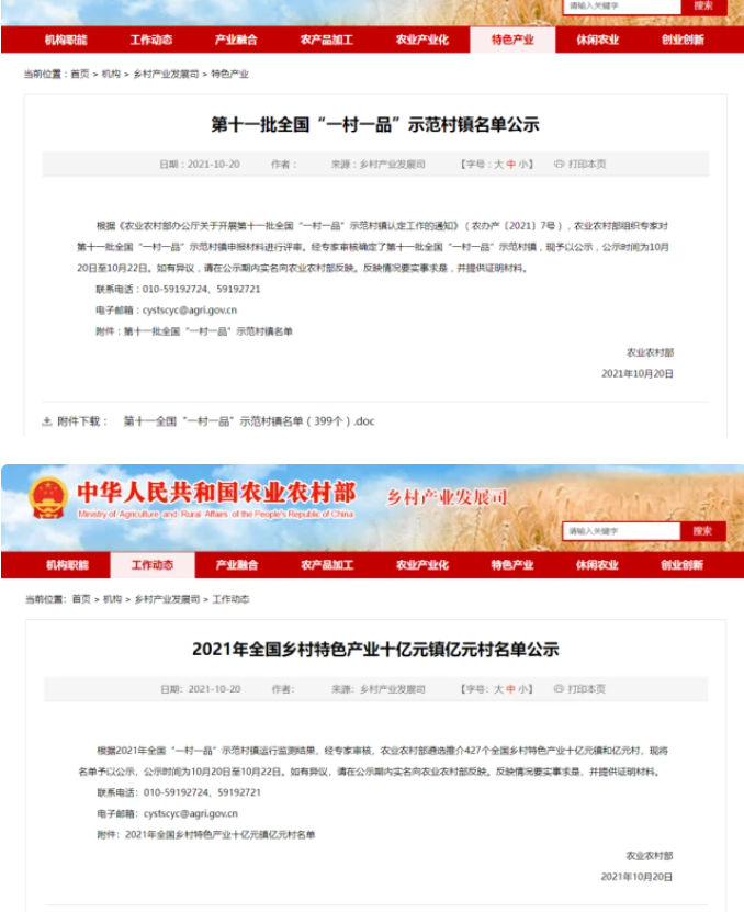 全国“一村一品”示范村镇名单