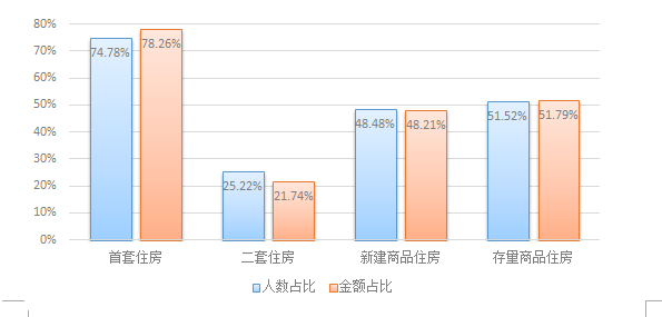 从贷款群体来看,刚需与改善型住房需求职工分别占贷款总人数的30.63%和61.88%。从单位性质来看,以其他城镇企业职工为主,贷款笔数和贷款金额占比分别为49.11%、48.25%。从购房面积来看,职工贷款购买小于90㎡、90-120㎡房屋居多,分别占贷款总人数的30.63%、37.14%。从主借人缴存基数来看,贷款主要以中、低收入职工为主,分别占贷款总人数的29.25%、69.21%。从贷款类型来看,纯公积金贷款和组合贷款占比分别为37.98%、62.02%。从贷款结构来看,首套住房公积金贷款职工占贷款总人数的74.78%,二套住房公积金贷款人数占25.22%。具体放贷结构如下: