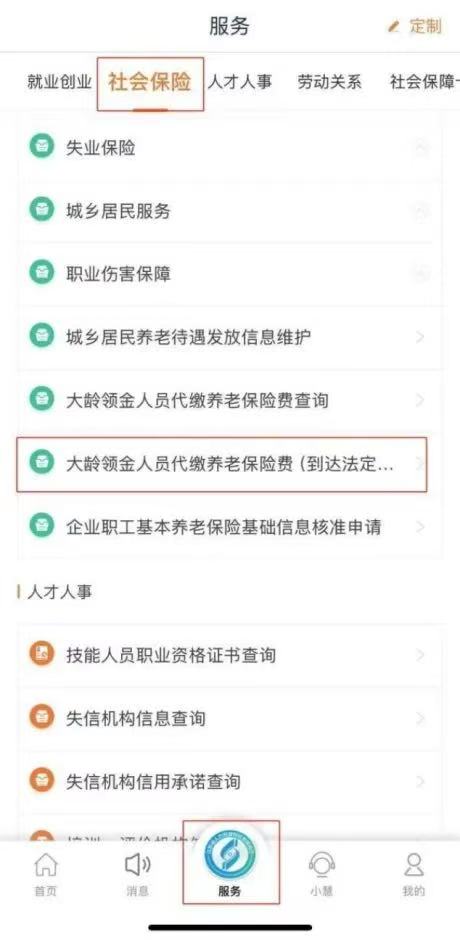 线上渠道1:登录“江苏智慧人社”APP,依次点击“服务—社会保险—大龄领金人员代缴养老保险费(到达法定退休年龄申请)”模块。