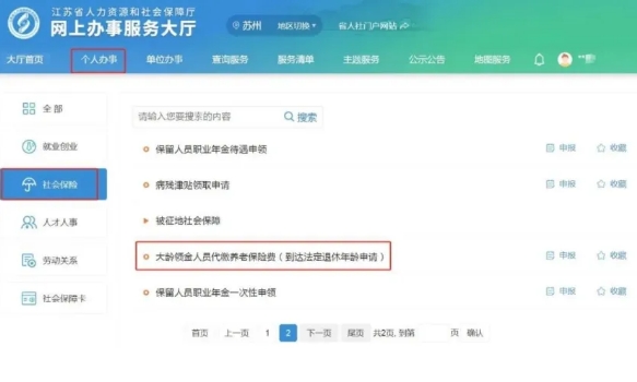 线上渠道2:登录江苏人社网上办事服务大厅(网址:https://rs.jshrss.jiangsu.gov.cn)(将地区设置为“无锡”),依次点击“澳门新葡京博彩官网—社会保险—大龄领金人员代缴养老保险费(到达法定退休年龄申请)”模块。
