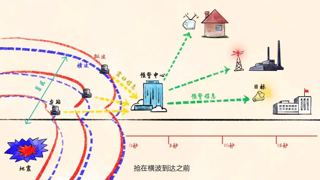 地震预警是在地震发生后,依托密集的地震观测站网,利用地震波传播速度远小于电波传播速度的特点,赶在破坏性地震波到达前,发出地震波即将到来的警报。