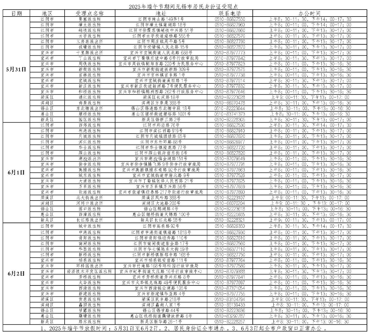5月31日至6月2日,各市(县)、区公安户籍窗口开设居民身份证受理点正常办理业务。