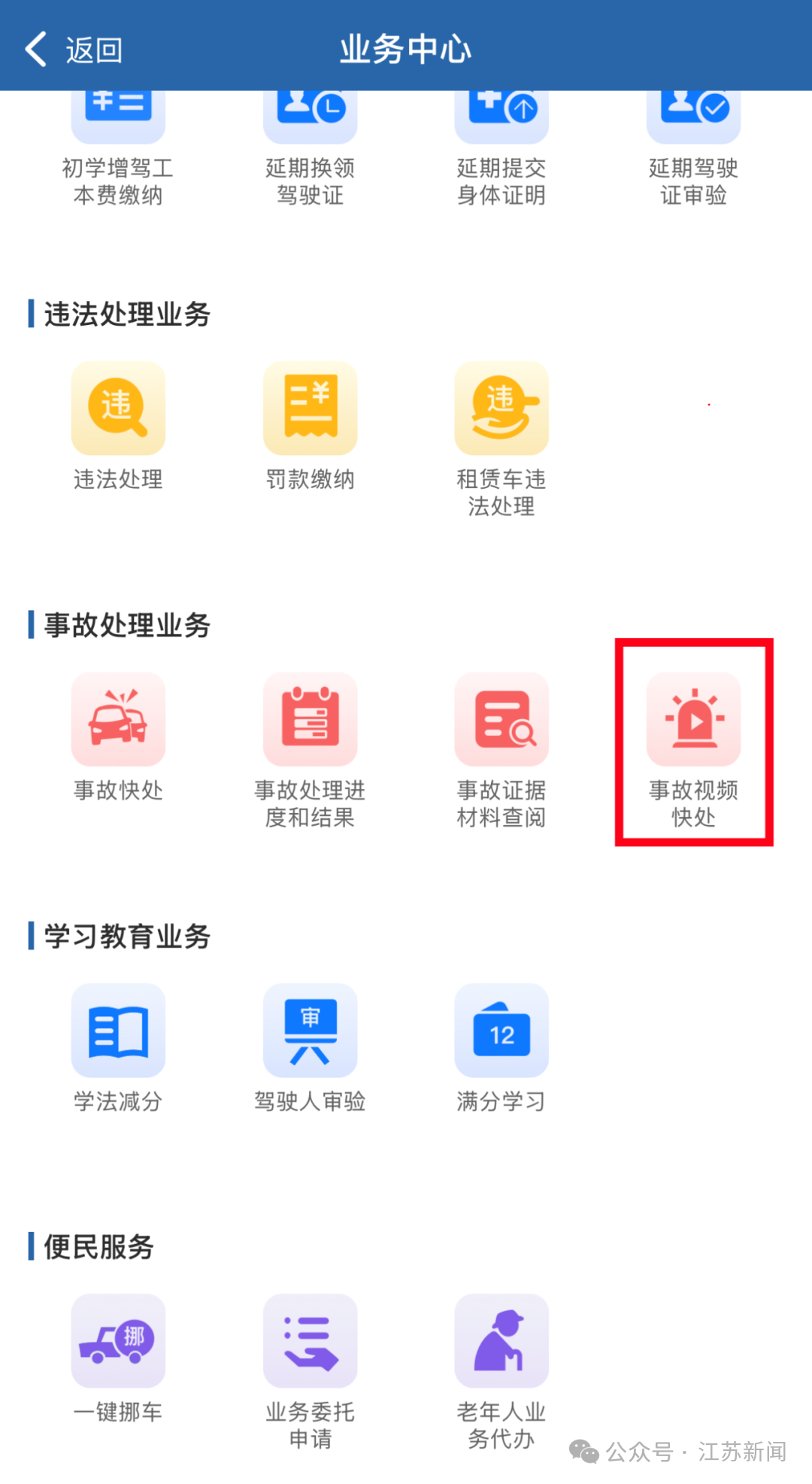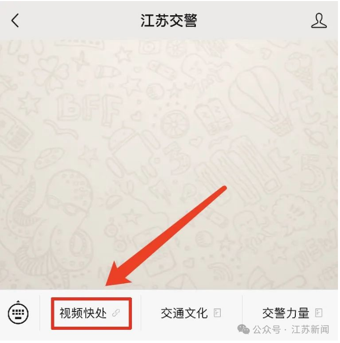 方法一:通过“江苏交警”微信公众号或者各地公安交管部门微信公众号点击“视频快处”;