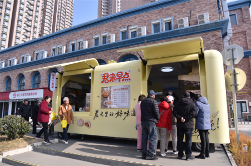 12月18日,第二家君来小食堂在梁溪区广益街道御墅花园128号开业。早上7点不到,不少居民已来到广益店,购买小食堂的招牌早点——“四大金刚”大饼、油条、粢饭和豆浆。由于人多,专门售卖“四大金刚”的早餐车前排起了队。