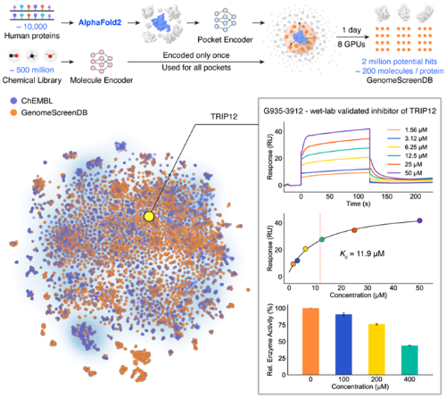 对比传统方法,DrugCLIP筛选速度提升了百万倍,在预测准确率上也有显著突破。假如利用当前最先进的分子对接工具筛选1万个蛋白靶点,一台计算机需要夜以继日工作数百年才能完成。借助DrugCLIP,一台基于128核CPU和8张GPU的计算节点只需一天的机时就可完成计算。依托DrugCLIP平台,团队首次完成了人类基因组规模的虚拟筛选项目,分析筛选超5亿个类药小分子,构建了当下已知最大规模的蛋白—配体筛选数据库。目前,数据库已免费向全球科研社区开放,为基础研究与早期药物发现提供强大数据支持。