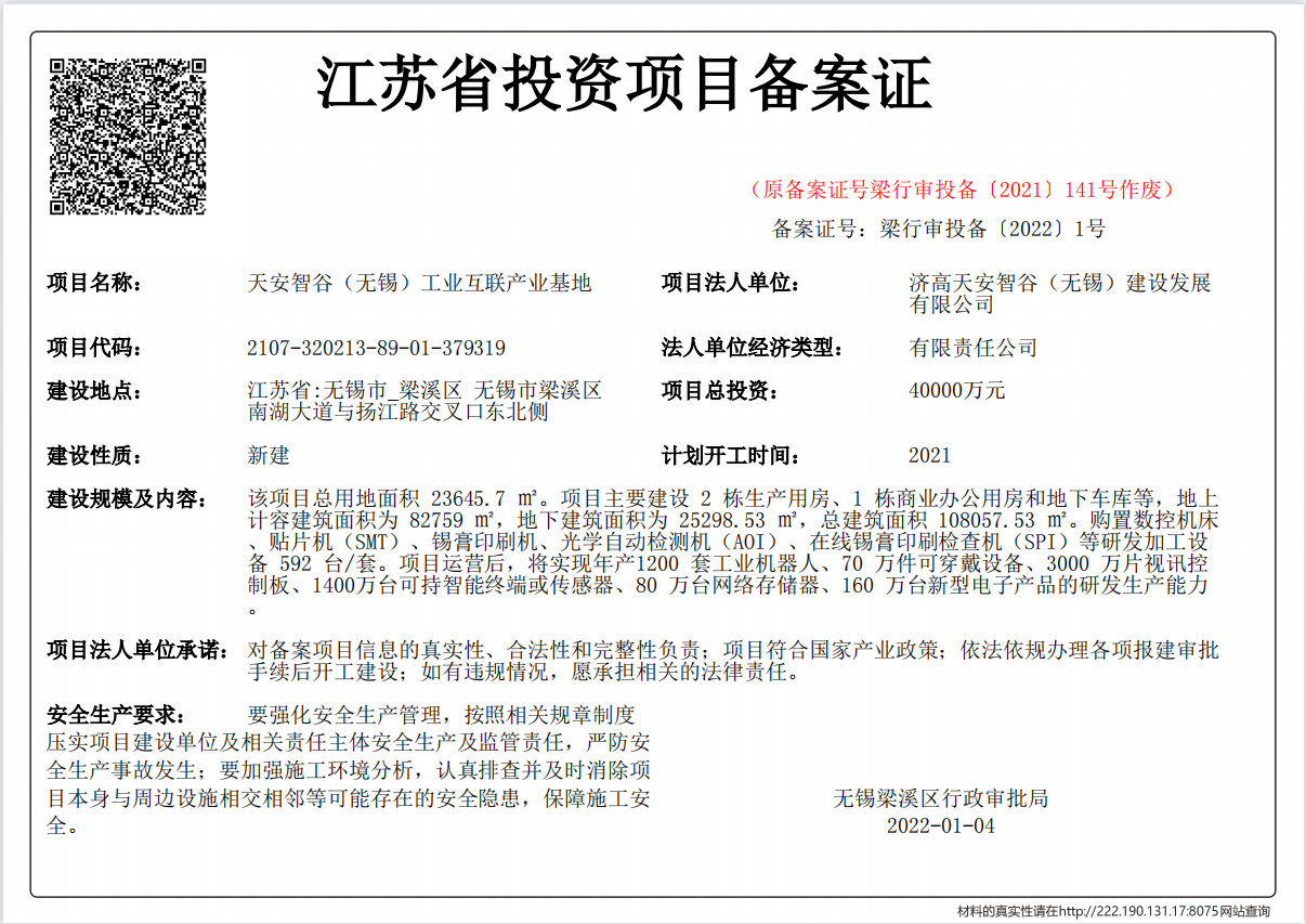 天安智谷(无锡)工业互联产业基地项目于2022年1月4日办结江苏省投资项目备案证,备案证号:梁行审投备【2022】1号,项目代码2107-320213-89-01-379319。