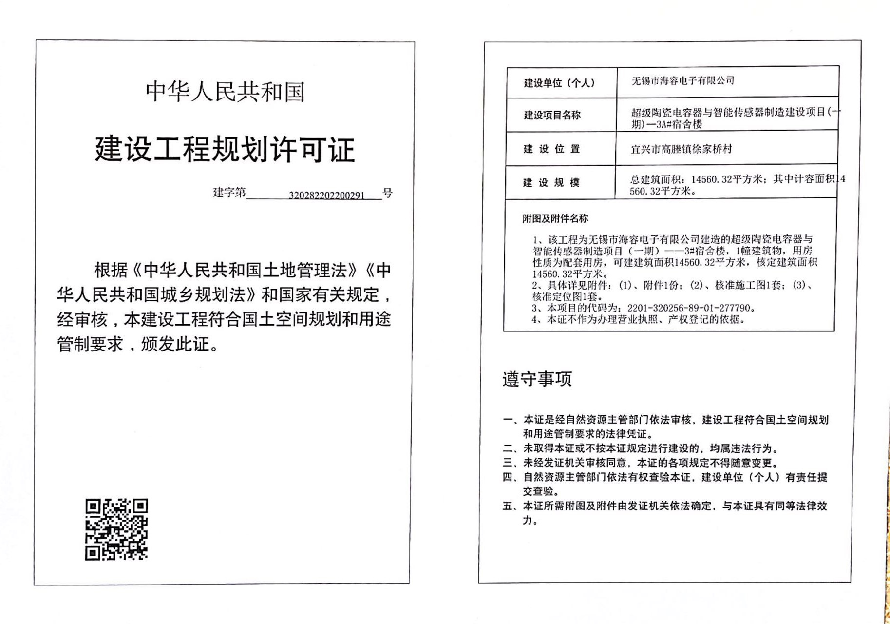 建设工程规划许可证公示(超级陶瓷电容器与智能传感器制造建设项目(一 期)—3A#宿舍楼)