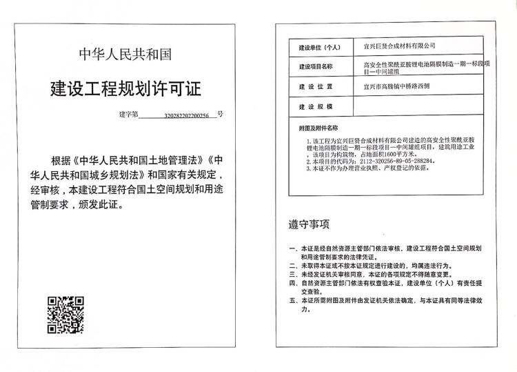 项目名称:高安全性聚酰亚胺锂电池隔膜制造一期一标段项目—中间罐组 建设单位:宜兴巨贤合成材料有限公司