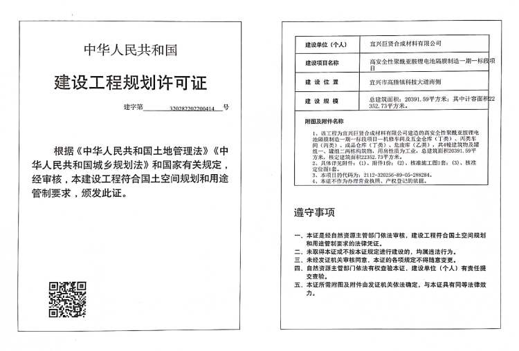 项目名称:高安全性聚酰亚胺锂电池隔膜制造一期一标段项目 建设单位:宜兴巨贤合成材料有限公司