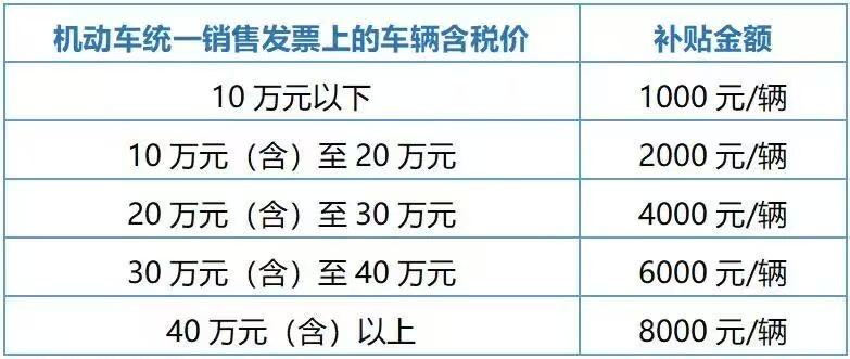 审核通过后,按机动车销售统一发票上的购车价格(含税价),分别给予一次性补贴。 ![]()