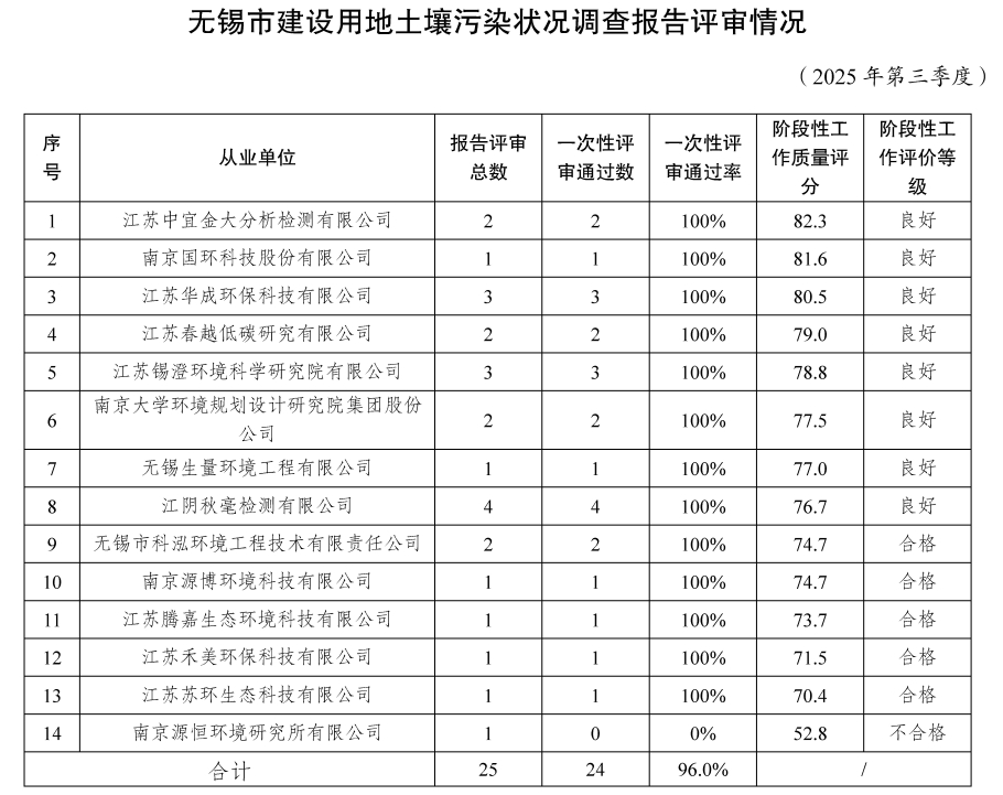 根据《澳门新葡京博彩官网建设用地土壤污染状况调查从业单位工作质量评价办法(试行)》,我局对全市2025年第三季度建设用地土壤污染状况调查报告评审情况进行了汇总,相关情况公示如下: