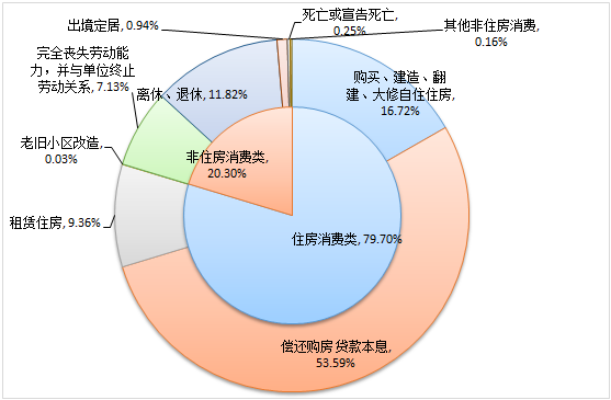 2025年三季度,住房消费类提取金额为53.51亿元,环比下降2.16%,占当季提取额的79.7%。其中还贷提取占比最高,提取金额35.98亿元,占当季提取额的53.59%。具体提取结构如下: