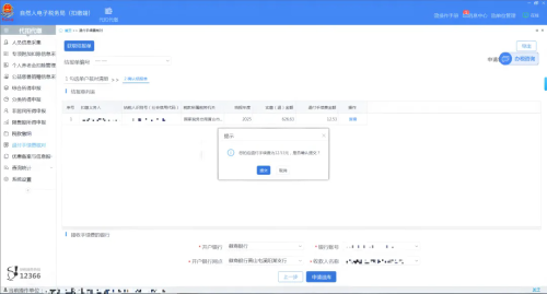 五 系统弹出提示框,点击【提交】。完成后系统将推送至税务机关及国库审核,审核通过后,申请的手续费将退到扣缴义务人办理退付手续费时选择的银行账户内。