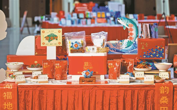 首先映入眼帘的是“一马当鲜”农产品展区。导购员指着一盘盘清蒸青鱼块、红烧划水、爆炒鱼肚等菜肴热心介绍:“这些青鱼菜肴是鹅湖特色菜,但烧制工序繁琐,现在我们制成了锁鲜装方便老百姓尝鲜。”一旁,非物质文化遗产青鱼的鱼拓画,以及文创产品青鱼书签、抱枕等,让人感觉这条鱼不仅活跃在唇齿间,也在多种休闲时刻摇曳生姿。